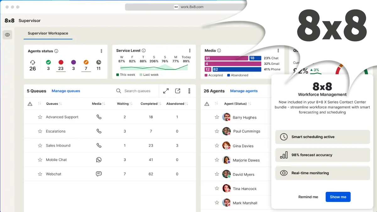 - New 8×8 Contact Centre standard WFM feature delivers smarter scheduling, better agent engagement, and faster time to value.
