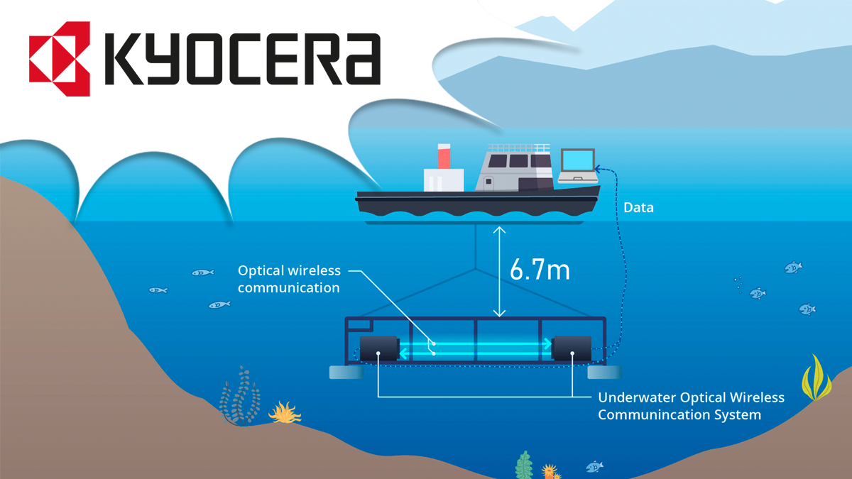 Kyocera Corporation (under the leadership of President: Hideo Tanimoto) announced recently that it achieved an underwater wireless optical communication (UWOC) high-speed rate of 750Mbps* with no latency, the world’s fastest to date, in a prototype system featuring Kyocera SLD GaN lasers. The offshore trials took place near Numazu City, Shizuoka Prefecture with the ultimate goal of 1Gbps speeds to advance high-speed, high-capacity communication for various underwater businesses, including underwater drones for marine research and smart aquaculture.